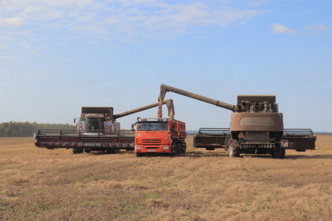 В разрезе культур это выглядит так: пшеница – 27,2 ц/га, ячмень – 24,1 ц/га, овёс – 22,7, горох – 26,2 ц/га, лён – 12,3 ц/га. На днях полеводы агрокомплекса "Маяк" приступили к уборке сои. Обмолочены первые 318 гектаров площадей, занятых этой культурой.