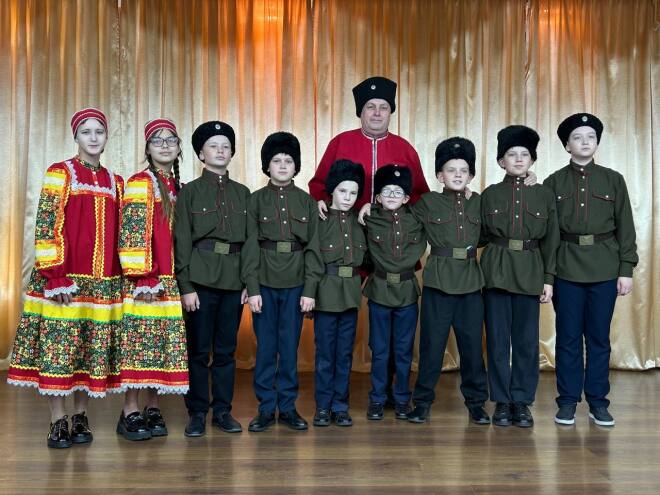 Коллектив «Хуторок» из Казанской школы основан в 2024 году. Дети собираются на репетиции, поют, учатся работать на сцене перед зрителями.