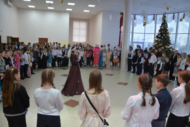 В холле второго этажа Казанского Дома культуры школьники водили хоровод у ёлки, играли в подвижные игры. Им вручили хорошие подарки.