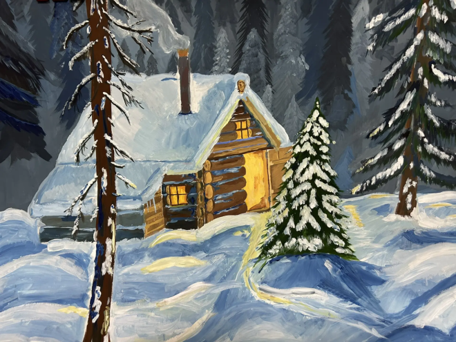 Еще одна картина привлекла мое внимание. На опушке леса стоит дом. Сумерки. Вокруг домика - огромные снежные ели. Мороз крепчает перед ночью, а в домике светятся окна, топится печь. Из трубы вьется дым. К дому ведет всего одна тропка, на которой видны человеческие следы. И тишина…