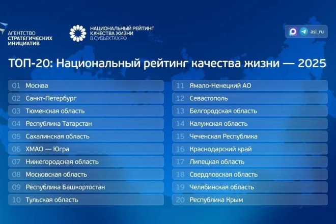 Тюменская область – в тройке лидеров Национального рейтинга качества жизни Тюменская область заняла третье место в Национальном рейтинге качества жизни. Об этом в своем официальном канале в мессенджере MAX сообщил глава региона Александр Моор.