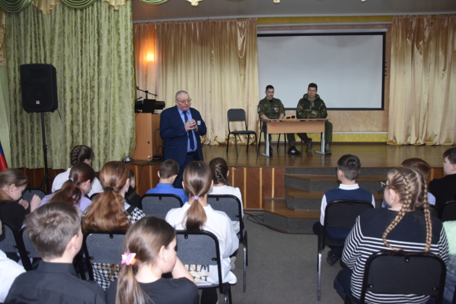 Учитель ОБЗР Евгений Барнёв представил школьникам гостей и отметил, что такие встречи способствуют воспитанию чувства гордости за свою страну и дают возможность напрямую пообщаться с теми, кто защищает Родину.